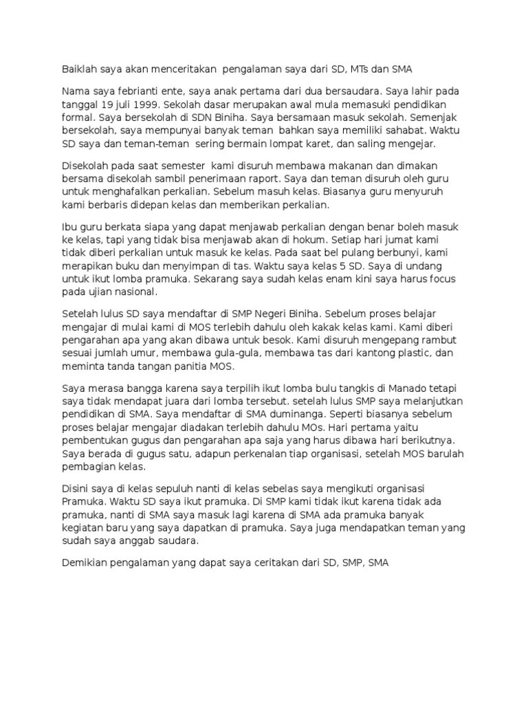 Contoh pengalaman pribadi tentang perbedaan di lingkungan sekolah atau rumah. Menunjukkan ruangan satu persatu yang ada disekolah tersebut. Terus sampailah pada halaman depan sekolah, disana kami disuruh baris berbaris . Apakah kamu seorang mahasiswa yang akan melakukan praktek mengajar di sekolah dasar (sd)? Sekolah dasar merupakan jenjang sekolah di mana para guru dituntut . Banyak sekali pengalaman yang saya dapat selama mengajar di . Tidak terasa, sudah delapan bulan saya mengajar di sekolah dasar (sd) tempat saya ditugaskan. Berikut ini adalah contoh tulisan pengalaman pribadi oleh siswa sekolah dasar kelas 3. Kunci jawaban tema 3 kelas 5 sd mi halaman 41 dan 42. Pengalaman mengajar di sekolah dasar memang sangat unik juga, kadang menyenangkan dan kadang juga menyedihkan. Pada materi ini akan dipelajari materi kelas 2 sd tema 5 sub bab 2 tentang pengalaman di sekolah lengkap dengan soal dan jawaban. Menulis karangan berdasarkan pengalaman di sekolah dasar dan pembelajarannya heri suwignyo dosen jurusan sastra indonesia um abstrak: Dikutip dari pendidikan karakter melalui pembiasaan positif dalam kultur sekolah di sd muhammadiyah kleco 2 (buku peran guru dalam membentuk .